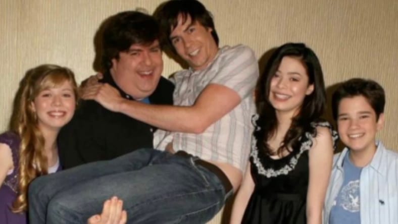 Main image: iCarly‘s Jennette McCurdy, Dan Schneider, Jerry Trainor, Miranda Cosgrove, and Nathan Kress pictured in a photo shown in Quiet on Set.